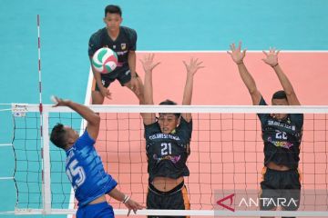 Pebola voli DKI Jakarta Affin Drinata (kiri) melakukan smes saat melawan tim voli Sulteng pada pertandingan fase grup bola voli putra PON XXI Aceh-Sumut 2024 di GOR Bola Voli Indoor Sumut Sport Center, Deli Serdang, Sumatera Utara, Rabu (11/9/2024). DKI Jakarta menang atas Sulteng dengan skor 25-16, 25-15, 25-16. ANTARA FOTO/Fauzan/tom.