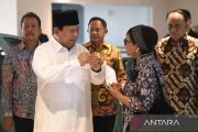 Menteri Pertahanan yang juga Presiden Terpilih Prabowo Subianto (kedua kiri) berbincang dengan Menteri Luar Negeri Retno Marsudi (kedua kanan) sebelum mengikuti sidang kabinet paripurna terakhir di Istana Garuda, Ibu Kota Nusantara (IKN), Penajam Paser Utara, Kalimantan Timur, Jumat (13/09/2024). Dalam sidang kabinet terakhir dari Kabinet Indonesia Maju itu Presiden Joko Widodo menyampaikan terima kasih atas dedikasi anggota kabinet, Panglima TNI dan Kapolri dalam melaksanakan program dan visi presiden dan wapres serta mengingatkan untuk menuntaskan program kerja utama yang sudah dimulai baik berkaitan dengan serapan, administrasi pertanggung jawaban, dan kendala yang belum terselesaikan. ANTARA FOTO/M Risyal Hidayat/Spt.