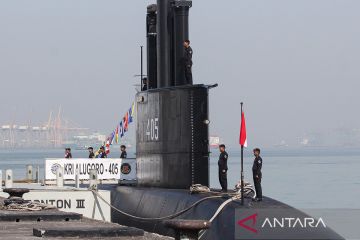 Sejumlah prajurit TNI AL berdiri di atas kapal selam KRI Alugoro 405 saat upacara peringatan HUT Ke-65 Hiu Kencana di depan Monumen Candrasa, Koarmada II, Surabaya, Jawa Timur, Jumat (13/9/2024). TNI AL menggelar peringatan HUT Ke-65 Hiu Kencana yaitu satuan khusus kapal selam dengan upacara militer dipimpin langsung KSAL. ANTARA FOTO/Didik Suhartono/Spt.
