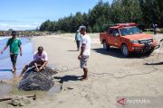 Petugas BPBD dan masyarakat mengevakuasi seekor hiu paus (Rhincodon typus) yang mati terdampar di Pantai Salido, Nagari Salido, Kabupaten Pesisir Selatan, Sumatera Barat, Jumat (13/9/2024). Dua ekor hiu paus terdampar pada Kamis (12/9), satu ekor berhasil diselamatkan warga dengan mendorong ke laut namun satu ekor lagi tidak terselamatkan sehingga dikuburkan di pantai itu. ANTARA FOTO/Yuka Fainka Putra/Ief/nym.