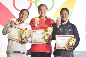 Perenang Bali Lilly Kartina Beales (tengah) berpose bersama perenang DKI Jakarta Angel Gabriella Yus (kiri) dan perenang Sulawesi Tengah Sofie Kemala Fatiha (kanan) saat penyerahan medali final renang 50 meter gaya kupu-kupu putri PON XXI Aceh-Sumut di Kolam Renang Selayang Dispora Sumatera Utara, Medan, Minggu (15/9/2024). Perenang Bali Lilly Kartina Beales meraih medali emas dengan catatan waktu 26,62 detik, medali perak diraih perenang DKI Jakarta Angel Gabriella Yus dengan catatan waktu 28,43 detik sedangkan medali perunggu diraih perenang Sulawesi Tengah Sofie Kemala Fatiha dengan catatan waktu 29,16 detik. ANTARA FOTO/Nova Wahyudi/YU