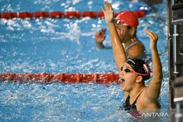 Perenang Bali Lilly Kartina Beales meluapkan kegembiraannya usai menjadi yang tercepat pada Final Renang 50 meter gaya kupu-kupu Putri PON XXI Aceh-Sumut di Kolam Renang Selayang Dispora Sumatera Utara, Medan, Minggu (15/9/2024). Perenang Bali Lilly Kartina Beales meraih medali emas dengan catatan waktu 26,62 detik, medali perak diraih perenang DKI Jakarta Angel Gabriella Yus dengan catatan waktu 28,43 detik sedangkan medali perunggu diraih perenang Sulawesi Tengah Sofie Kemala Fatiha dengan catatan waktu 29,16 detik. ANTARA FOTO/Nova Wahyudi/YU