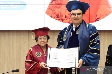 Presiden kelima RI Megawati Soekarnoputri (kiri) menerima sertifikat gelar profesor kehormatan dari Rektor Universitas Silk Road Internasional sekaligus Menteri Menteri Pariwisata dan Warisan Budaya Republik Uzbekistan Aziz Abduhakimov di Samarkand, Uzbekistan, Sabtu (21/9/2024). Megawati mendapat gelar Profesor Kehormatan di Bidang Pariwisata Budaya Berkelanjutan (Sustainable Cultural Tourism) dari Universitas Silk Road Internasional yang juga merupakan gelar kehormatan ketiga yang diterima oleh putri Bung Karno tersebut. ANTARA FOTO/Monang Sinaga/YU