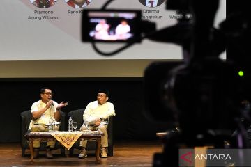Pasangan calon Gubernur dan Wakil Gubernur DKI Jakarta Ridwan Kamil (kiri) - Suswono (kanan) menyampaikan pandangannya saat Dialog Publik Seni di Taman Ismail Marzuki, Jakarta Pusat, Senin (23/9/2024). Dialog bersama tiga pasangan calon Gubernur dan calon Wakil Gubernur DKI Jakarta tersebut membahas peran seni budaya sebagai pilar pengembangan Jakarta Kota Global. ANTARA FOTO/ Fakhri Hermansyah/agr
