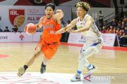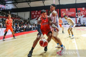 Pebasket Pelita Jaya Jakarta Muhamad Arighi (kiri) berusaha melewati pebasket Prawira Harum Bandung Indra Muhamad (kanan) pada laga semifinal IBL All Indonesian Piala Menpora di Hall Basket Senayan, Gelora Bung Karno, Jakarta, Minggu (29/9/2024). Pelita Jaya Jakarta mengalahkan Prawira Harum Bandung dengan skor 69-63. ANTARA FOTO/Asprilla Dwi Adha/tom.