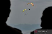 Peserta kategori cross country mengudara di atas Waduk Jatigede saat mengikuti West Java Paragliding Championship di Batu Dua, Kabupaten Sumedang, Jawa Barat, Selasa, (1/10/2024). Kejuaraan Intenasional Paralayang yang diikuti 99 peserta dari 10 negara di Eropa dan Asia tersebut digelar untuk mengasah bakat potensial atlet tanah air sehingga dapat bersaing pada kompetisi internasional serta guna mendongkrak potensi wisatawan berkunjung ke Kabupaten Sumedang. ANTARA FOTO/Raisan Al Farisi/Spt.