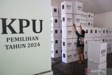 Relawan menata kotak suara yang selesai dirakit di gudang logistik KPU Kota Mataram, Nusa Tenggara Barat, Jumat (4/10/2024). KPU Kota Mataram menyiapkan sebanyak 1.172 kotak suara sebagai kebutuhan kelengkapan 581 tempat pemungutan suara (TPS) untuk tahap pencoblosan pada Pilkada Serentak yang akan terlaksana 27 November 2024. ANTARA FOTO/Dhimas Budi Pratama/aww.