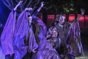 Penari menampilkan tarian Topeng Labu pada pertunjukan seni Festival Tabun Tawar 8 Lawang Sejerangan di kawasan wisata Lubuk Penyengat, Desa Baru, Muaro Jambi, Jambi, Sabtu (5/10/2024). Tarian ini diangkat dari cerita turun temurun masyarakat Desa Muara Jambi tentang kerinduan para penderita kusta kepada keluarga saat mereka diasingkan ke hutan pada masa lampau. ANTARA FOTO/Wahdi Septiawan/foc.