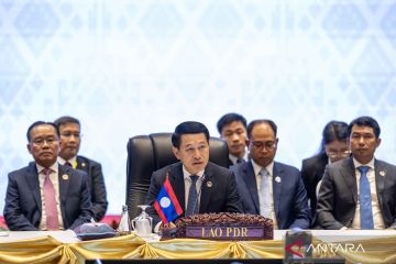 Menteri Luar Negeri Laos Saleumxay Kommasith (tengah) memimpin dan membuka pertemuan ASEAN Foreign Minister Meeting (AMM) di sela-sela Konferensi Tingkat Tinggi (KTT) ke-44 dan ke-45 ASEAN 2024 di National Convention Center, Vientiane, Laos, Selasa (8/10/2024). KTT ASEAN 2024 yang berlangsung pada 8-11 Oktober 2024 tersebut mengangkat tema ASEAN: Meningkatkan Konektivitas dan Resiliensi. ANTARA FOTO/M Agung Rajasa/nym.