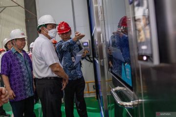 Menko Marves Luhut Binsar Pandjaitan (tengah) bersama CEO Changzhou Liyuan, Shi Junfeng (kiri) mendengarkan penjelasan Director of PT LBM Energi Baru Indonesia Soo Hui Jin (kanan) tentang operasional pabrik di sela-sela acara peresmian tahap pertama produksi pabrik katoda Lithium Iron Phospate (LFP) yang merupakan bahan baku baterai lithium dan penandatanganan kemitraan investasi strategis antara konsorsium Indonesia Investment Authority (INA) dan Changzhou Liyuan New Energy Technology Co., Ltd untuk rencana ekspansi fasilitas produksi bahan katoda LFP pada PT LBM Energi Baru Indonesia di Kawasan Ekonomi Khusus Kabupaten Kendal, Jawa Tengah, Selasa (8/10/2024). Pabrik Katoda LFP berkapasitas produksi 30.000 ton pada fase pertama yang rencananya akan berekspansi tambahan 90.000 ton pada fase II (total kapasitas 120.000 ton per tahun pada akhir 2025) melalui kemitraan investasi strategis itu diharapkan akan berperan penting dalam memenuhi permintaan global terhadap baterai LFP, mampu menyediakan sebanyak 2.000 lapangan kerja yang 92 persen di antaranya pekerja lokal, serta memperkuat posisi Indonesia dalam ekosistem industri kendaraan listrik. ANTARA FOTO/Aji Styawan/foc.