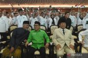 Ketua Umum PKB Muhaimin Iskandar (tengah) dan calon presiden terpilih Prabowo Subianto (kanan) menghadiri pembukaan Rapat Koordinasi Nasional Legislatif PKB di Jakarta, Kamis (10/10/2024). Rapat tersebut membahas koordinasi sinergi legislatif PKB di tingkat DPRD Kabupaten/Kota, Provinsi, dan DPR. ANTARA FOTO/Indrianto Eko Suwarso/aww.
