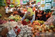 Calon Gubernur Jawa Timur nomor urut dua Khofifah Indar Parawansa membeli dagangan saat berkampanye di pasar Sepanjang, Taman, Sidoarjo, Jawa Timur, Rabu (16/10/2024). Khofifah mensosialisasikan dirinya sebagai calon gubernur serta meninjau fasilitas pasar dan mendengarkan keluhan dari sejumlah pedagang terkait pasokan kebutuhan sehari-hari. ANTARA FOTO/Umarul Faruq/rwa.