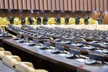 Personel TNI melakukan simulasi pengamanan VVIP di Ruang Rapat Paripurna I Gedung Nusantara, Kompleks Parlemen, Senayan, Jakarta, Kamis (17/10/2024). Sejumlah persiapan dilakukan jelang pelantikan Presiden dan Wakil Presiden terpilih Prabowo Subianto dan Gibran Rakabuming Raka akan diambil sumpahnya sebagai Presiden dan Wakil Presiden masa bakti 2024 - 2029 pada Minggu (20/10). ANTARA FOTO/Rivan Awal Lingga/nym.