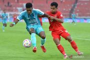 Pesepak bola PSBS Biak Jeam Kelly Sroyer (kiri) berebut bola dengan pesepak bola Semen Padang Dwi Geno Nofiansyah (kanan) saat pertandingan Liga 1 2024/2025 di Stadion Kapten I Wayan Dipta, Gianyar, Bali, Jumat (18/10/2024). ANTARA FOTO/Fikri Yusuf/aww.