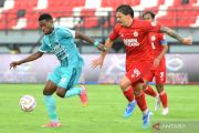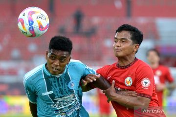 Pesepak bola PSBS Biak Armando Obet Oropa (kiri) berebut bola dengan pesepak bola Semen Padang Tin Martic (kanan) saat pertandingan Liga 1 2024/2025 di Stadion Kapten I Wayan Dipta, Gianyar, Bali, Jumat (18/10/2024). ANTARA FOTO/Fikri Yusuf/aww.