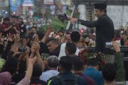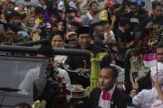 Presiden ketujuh RI Joko Widodo (tengah) dari atas kendaraan menyapa warga saat keluar dari Pangkalan Udara TNI AU Adi Soemarmo, Boyolali, Jawa Tengah, Minggu (20/10/2024). Joko Widodo resmi purna tugas dari Presiden Indonesia dan kembali pulang ke Solo. ANTARA FOTO/Aloysius Jarot Nugroho/foc.