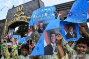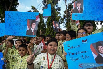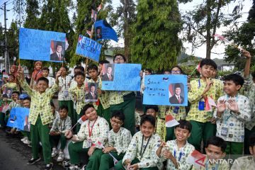 Sejumlah siswa membentangkan poster dan bendera Merah Putih saat akan menyambut kegiatan rapat kerja Presiden Prabowo Subianto dan retret Kabinet Merah Putih 2024-2029 di kawasan Akademi Militer (Akmil) Magelang, Jawa Tengah, Kamis (24/10/2024). Para menteri dan wakil menteri Kabinet Merah Putih akan mengikuti kegiatan pembekalan pada 25-27 Oktober 2024 di Akmil Magelang. ANTARA FOTO/Muhammad Adimaja/aww.