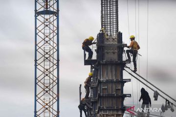 Sejumlah pekerja menyelesaikan pembangunan proyek revitalisasi Pasar Pagi Samarinda, Kalimantan Timur, Kamis (31/10/2024). Berdasarkan data dari Pemerintah Kota Samarinda, revitalisasi pasar tradisional yang rencananya akan dibangun enam lantai dengan konsep semi modern dengan menyerap anggaran sebesar Rp450 miliar itu progres pembangunannya baru mencapai 23 persen. ANTARA FOTO/M Risyal Hidayat/YU