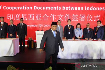 Presiden Prabowo Subianto (keempat kiri) menyaksikan penandatanganan nota kesepahaman (MoU) antara perusahaan Indonesia dan China dengan nilai mencapai 10,07 miliar dolar AS dalam Indonesia-China Business Forum 2024 di Beijing, China pada Minggu (10/11/2024). Acara yang digagas Kamar Dagang dan Industri (Kadin) Indonesia Komite Tiongkok (KIKT) itu melibatkan sekitar 20 perusahaan di bidang manufaktur canggih, energi terbarukan, kesehatan, hilirisasi, ketahanan pangan dan keuangan. ANTARA FOTO/Desca Lidya Natalia/wpa.