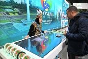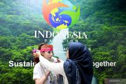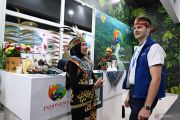 Petugas berbusana adat Dayak berbincang dengan pengunjung mancanegara yang mengenakan udeng atau ikat kepala khas Bali di Paviliun Indonesia pada Konferensi Perubahan Iklim COP29 UNFCCC di Baku, Azerbaijan, Rabu (13/11/2024). Paviliun Indonesia selain sebagai upaya soft diplomacy untuk menyuarakan aksi, strategi, dan inovasi Indonesia kepada dunia internasional, sebagai wujud nyata bersama-sama memimpin aksi iklim, juga menjadi ajang promosi budaya dan seni RI kepada masyarakat dunia. ANTARA FOTO/Andika Wahyu/foc.