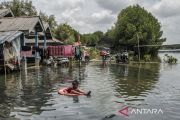 Seorang anak berenang menggunakan pelampung saat banjir rob di Kampung Sembilangan, Tarumajaya, Kabupaten Bekasi, Jawa Barat, Senin (18/11/2024). Banjir rob akibat pasang air laut menggenangi wilayah tersebut selama empat hari dengan ketinggian 30-50 cm. ANTARA FOTO/ Fakhri Hermansyah/rwa.