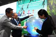 Direktur Bina Pengolahan dan Pemasaran Hasil Hutan Kementerian Kehutanan Ristianto Pribadi (kiri) bersama Kepala Pusat Standarisasi Instrumen Ketahanan Bencana dan Perubahan Iklim (PUSTANDPI) Kementerian Kehutanan Krisdianto (tengah) menjelaskan inisiatif aksi mitigasi dan adaptasi perubahan iklim yang dilakukan Indonesia kepada pengunjung mancanegara (kanan) melalui LED Globe di Paviliun Indonesia COP29 UNFCCC, Baku, Azerbaijan, Selasa (19/11/2024). Medium informasi mutakhir tersebut menampilkan berbagai informasi aksi sinergi perubahan iklim yang dilakukan berbagai pemangku kepentingan. ANTARA FOTO/Andika Wahyu/foc.