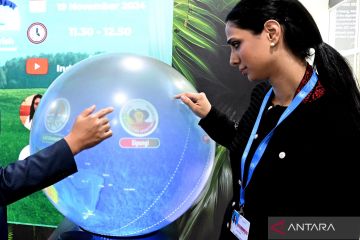 Pengunjung mancanegara mendapat penjelasan tentang inisiatif aksi mitigasi dan adaptasi perubahan iklim yang dilakukan Indonesia, melalui LED Globe di Paviliun Indonesia COP29 UNFCCC, Baku, Azerbaijan, Selasa (19/11/2024). Medium informasi mutakhir tersebut menampilkan berbagai informasi aksi sinergi perubahan iklim yang dilakukan berbagai pemangku kepentingan. ANTARA FOTO/Andika Wahyu/Spt.