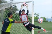 Kiper Timnas Indonesia Daffa Fasya (kanan) berupaya menangkap bola saat mengikutii latihan untuk persiapan Piala AFF 2024 di Bali United Training Center, Gianyar, Bali, Jumat (29/11/2024). Timnas Indonesia tergabung dalam Grup B bersama Vietnam, Filipina, Myanmar, dan Laos dalam Piala AFF 2024 yang dimulai pada 9 Desember 2024. ANTARA FOTO/Nyoman Hendra Wibowo/aww.