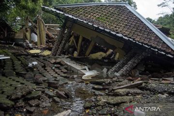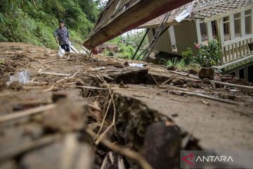 urnalis melihat rumah yang rusak terdampak bencana pergerakan tanah di Kadupandak, Kabupaten Cianjur, Jawa Barat, Jumat (6/12/2024). Badan Nasional Penanggulangan Bencana (BNPB) menyatakan dampak bencana geologi pergerakan tanah dari dua kecamatan di Kabupaten Cianjur tersebut mengakibatkan sebanyak 85 rumah rusak berat serta 105 unit rumah berpotensi terancam sejak peristiwa yang terjadi pada Jumat (22/11) lalu. ANTARA FOTO/Novrian Arbi/YU