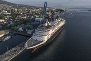 Foto udara Kapal Pesiar MV Vasco Da Gama bersandar di Pelabuhan Ahmad Yani, Ternate, Maluku Utara, Selasa (10/12/2024). Kapal pesiar berbendera Portugal yang memiliki panjang 219 meter dan lebar 31 meter itu membawa sekitar 800 wisatawan dari berbagai negara untuk mengunjungi sejumlah tempat wisata sejarah di Ternate dan sekitarnya. ANTARA FOTO/Andri Saputra/foc.