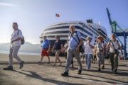 Sejumlah wisatawan asing turun dari Kapal Pesiar MV Vasco Da Gama saat bersandar di Pelabuhan Ahmad Yani, Ternate, Maluku Utara, Selasa (10/12/2024). Kapal pesiar berbendera Portugal yang memiliki panjang 219 meter dan lebar 31 meter itu membawa sekitar 800 wisatawan dari berbagai negara untuk mengunjungi sejumlah tempat wisata sejarah di Ternate dan sekitarnya. ANTARA FOTO/Andri Saputra/foc.