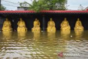 Patung Buddha terendam banjir rob di Kampung Dadap, Kosambi, Kabupaten Tangerang, Banten, Minggu (15/12/2024). Badan Penanggulangan Bencana Daerah (BPBD) Kabupaten Tangerang menyebutkan sebanyak 1.963 jiwa di tiga rukun warga (RW) terdampak banjir rob sejak Jumat (13/12). ANTARA FOTO/Sulthony Hasanuddin/tom.