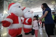 Pekerja bandara menggunakan kostum Sinterklas bermain dengan anak saat Parade Sinterklas di Terminal 3 Bandara Soekarno Hatta, Tangerang, Banten, Jumat (20/12/2024). Parade sinterklas tersebut dalam rangka menyambut Natal 2024 untuk menghibur para penumpang dan pengguna jasa Bandara Soekarno Hatta. ANTARA FOTO/Muhammad Iqbal/foc.