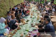 Warga menyantap makanan bersama saat tradisi Nyadran Perdamaian di Dusun Toleransi Krecek, Getas, Kaloran, Temanggung, Jawa Tengah, Jumat (27/12/2024). Tradisi nyadran atau merti dusun yang diikuti umat Islam, Buddha, Katolik dan ajaran Sapta Dharma tersebut merupakan tradisi turun temurun sebagai toleransi dan kerukunan warga lintas agama sekaligus untuk mempererat kembali kerukunan dan persatuan usai pelaksanaan Pilkada 2024. ANTARA FOTO/Anis Efizudin/Spt.