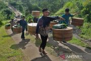 Warga memikul tenong berisi makanan saat tradisi Nyadran Perdamaian di dusun toleransi Krecek, Getas, Kaloran, Temanggung, Jawa Tengah, Jumat (27/12/2024). Tradisi nyadran atau merti dusun yang diikuti umat Islam, Buddha, Katolik dan ajaran Sapta Dharma tersebut merupakan tradisi turun temurun sebagai toleransi dan kerukunan warga lintas agama sekaligus untuk mempererat kembali kerukunan dan persatuan usai pelaksanaan Pilkada 2024. ANTARA FOTO/Anis Efizudin/Spt.