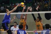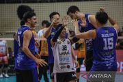 Pevoli putra Jakarta Lavani Livin Transmedia Dio Zulfikri (kanan) melakukan selebrasi dengan rekan setimnya usai mencetak poin atas lawannya tim Jakarta Bhayangkara Presisi dalam pertandingan putaran pertama pekan pertama PLN Mobile Proliga 2025 di GOR Jatidiri, Semarang, Jawa Tengah, Jumat (3/1/2025). Jakarta Lavani Livin Transmedia mengalahkan Jakarta Bhayangkara Presisi dengan skor 3-1 (18-25, 25-14, 25-19, 25-23). ANTARA FOTO/Makna Zaezar/tom.