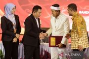 Ketua KPU Jawa Barat Ahmad Nur Hidayat (kedua kiri) bersama anggota KPU Aneu Nursifah (kiri) berjabat tangan dengan Pasangan Gubernur dan Wakil Gubernur terpilih Provinsi Jawa Barat Dedi Mulyadi (kedua kanan) dan Erwan Setiawan (kanan) usai memberikan surat Penetapan Pasangan Gubernur dan Wakil Gubernur Terpilih Provinsi Jawa Barat 2024 di Hotel Grand Mercure, Bandung, Jawa Barat, Kamis (9/1/2024). KPU Jawa Barat menetapkan pasangan Dedi Mulyadi dan Erwan Setiawan sebagai Gubernur dan Wakil Gubernur Jawa Barat periode 2025-2030 dengan perolehan suara sebanyak 14.130.192 atau unggul 62,22 persen pada Pilkada serentak 2024 lalu. ANTARA FOTO/Novrian Arbi/wpa.