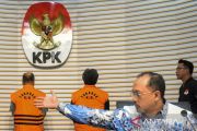 Direktur PT Prakarsa Nusa Bakti (PNB) periode 2012-2016 Roberto Pangasian Lumban Gaol (kanan) dan pegawai PT Prakarsa Nusa Bakti (2016-2018) Afrian Jafar (kedua kiri) dihadirkan dalam konferensi pers penetapan dan penahanan tersangka kasus dugaan korupsi pengadaan server dan storage oleh PT PNB kepada PT SCC di Gedung Merah Putih KPK, Jakarta, Jumat (10/1/2025). KPK menahan Roberto Pangasian Lumban Gaol dan Afrian Jafar terkait dugaan korupsi pengadaan atau pembelian fiktif server dan storage oleh PT Prakarsa Nusa Bakti (PNB) kepada PT Sigma Cipta Caraka (SCC) yang merupakan anak Perusahaan PT. Telkom pada tahun 2017 yang menyebabkan kerugian negara sebesar Rp280 miliar. ANTARA FOTO/Indrianto Eko Suwarso/rwa.