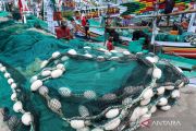 Sejumlah nelayan memperbaiki jaring di Pelabuhan Muncar, Banyuwangi, Jawa Timur, Selasa (14/1/2025). Sebagian nelayan di daerah tersebut memilih untuk tidak melaut dan mengisi waktu dengan memperbaiki jaringnya pada fase bulan atau bulan purnama karena ikan cenderung berenang lebih dalam atau berpindah tempat sehingga menyebabkan ikan lebih sulit ditangkap dan tidak sebanding dengan biaya operasional. ANTARA FOTO/Budi Candra Setya/nz
