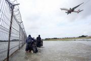 Pengendara motor mendorong motornya yang mati mesin karena menerobos banjir yang merendam Jalan Parimeter Utara Bandara Soekarno Hatta, Tangerang, Banten, Rabu (29/1/2025). Banjir setinggi 40 cm tersebut akibat tingginya intensitas hujan yang mengguyur daerah tersebut. ANTARA FOTO/Muhammad Iqbal/foc.