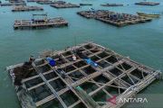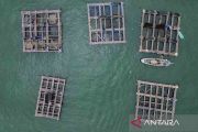 Foto udara keramba jaring apung milik petani di pesisir pulau Gili Ketapang, Kabupaten Probolinggo, Jawa Timur, Senin (3/2/2025). Kementerian Kelautan dan Perikanan (KKP) siap meningkatkan produksi perikanan Jawa Timur untuk mendukung pencapaian swasembada pangan di tahun 2027 dengan memperluas aktivitas budi daya perikanan yang menurut data periode 2020-2023 rata-rata produksi perikanan budi daya mencapai 598 ribu ton, lebih tinggi dibandingkan perikanan tangkap dengan total 536 ribu ton. ANTARA FOTO/Irfan Sumanjaya/rwa.