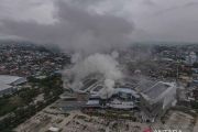 Foto udara suasana kebakaran di sebuah pusat perbelanjaan di Kendari, Sulawesi Tenggara, Selasa (11/2/2025). Api yang mulai berkobar pada pukul 06.30 WITA itu dapat dikendalikan setelah tujuh unit mobil pemadam kebakaran beserta 70 personel tiba di lokasi dan hingga saat ini penyebab kebakaran masih dalam penyelidikan. ANTARA FOTO/Andry Denisah/YU