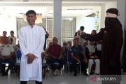 Algojo (kiri) mengeksekusi cambuk terpidana (tengah) pelanggar peraturan daerah (qanun) tentang hukum syariat Islam di Banda Aceh, Aceh, Kamis (27/2/2025). Mahkamah Syar'iah Kota Banda Aceh menvonis 80 hingga 85 kali cambuk karena melanggar qanun Aceh nomor 6/2014 tentang hukum jinayat terhadap dua terpidana kasus berhubungan seksual sesama jenis (gay). ANTARA FOTO / Irwansyah Putra/YU