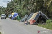 Kendaraan melintas di samping deretan tenda darurat warga korban banjir di Desa Punti Kalo, Sumay, Tebo, Jambi,