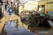 Tiga anak bermain di lokasi banjir yang merendam Dayeuhkolot, Kabupaten Bandung, Jawa Barat, Minggu (16/3/2025).. Intensitas curah hujan tinggi mengakibatkan Sungai Citarum meluap dan kembali merendam tiga kecamatan yakni Bojongsoang, Baleendah, dan Dayeuhkolot, Bandung Selatan, setinggi hingga 2 meter. ANTARA FOTO/Novrian Arbi/Spt.