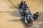 Warga menggunakan perahu melintasi banjir yang merendam Dayeuhkolot, Kabupaten Bandung, Jawa Barat, Minggu (16/3/2025). Intensitas curah hujan tinggi mengakibatkan Sungai Citarum meluap dan kembali merendam tiga kecamatan yakni Bojongsoang, Baleendah, dan Dayeuhkolot, Bandung Selatan, setinggi hingga 2 meter. ANTARA FOTO/Novrian Arbi/Spt.