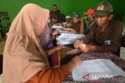 Petugas membagikan uang tunjangan hari raya (THR) kepada warga di Kantor Desa Wunut, Tulung, Klaten, Jawa Tengah, Selasa (18/3/2025). Pemerintah setempat memberikan THR kepada 2.289 warga dengan besaran Rp200 ribu per orang atau total anggaran Rp457,8 juta yang diambil dari sumber dana hasil usaha BUMDes Sumber Kamulyan. ANTARA FOTO/Aloysius Jarot Nugroho/rwa.
