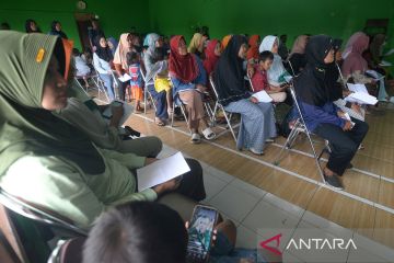 Warga antre saat pembagian uang tunjangan hari raya (THR) dari pemerintah desa di Kantor Desa Wunut, Tulung, Klaten, Jawa Tengah, Selasa (18/3/2025). Pemerintah desa setempat memberikan THR kepada 2.289 warga dengan besaran Rp200 ribu per orang atau total anggaran Rp457,8 juta yang diambil dari sumber dana hasil usaha BUMDes Sumber Kamulyan. ANTARA FOTO/Aloysius Jarot Nugroho/rwa.