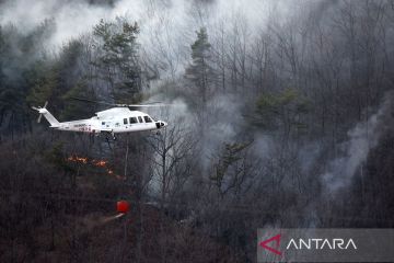 Sebuah helikopter melakukan penyemprotan air di lokasi kebakaran hutan di Provinsi Gyeongsang Utara, Korea Selatan, Sabtu (22/3/2025). Pemerintah Korea Selatan mengumumkan status bencana nasional atas kebakaran hutan besar di wilayah tenggara negara itu yang telah menewaskan empat orang. ANTARA FOTO/NEWSIS via Xinhua/tom.