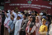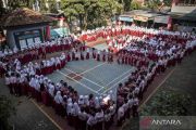 Sejumlah siswa berbaris saat mengikuti halalbihalal hari pertama masuk sekolah di SD Negeri Pekunden, Semarang, Jawa Tengah, Rabu (9/4/2025). Guru dan para siswa setempat menggelar acara halalbihalal dengan saling bersalam dan makan bersama sebelum memulai kegiatan belajar mengajar untuk mempererat tali silaturahim sekaligus mendidik rasa saling memaafkan pada momen Lebaran Idul Fitri 1446 Hijriah. ANTARA FOTO/Makna Zaezar/YU